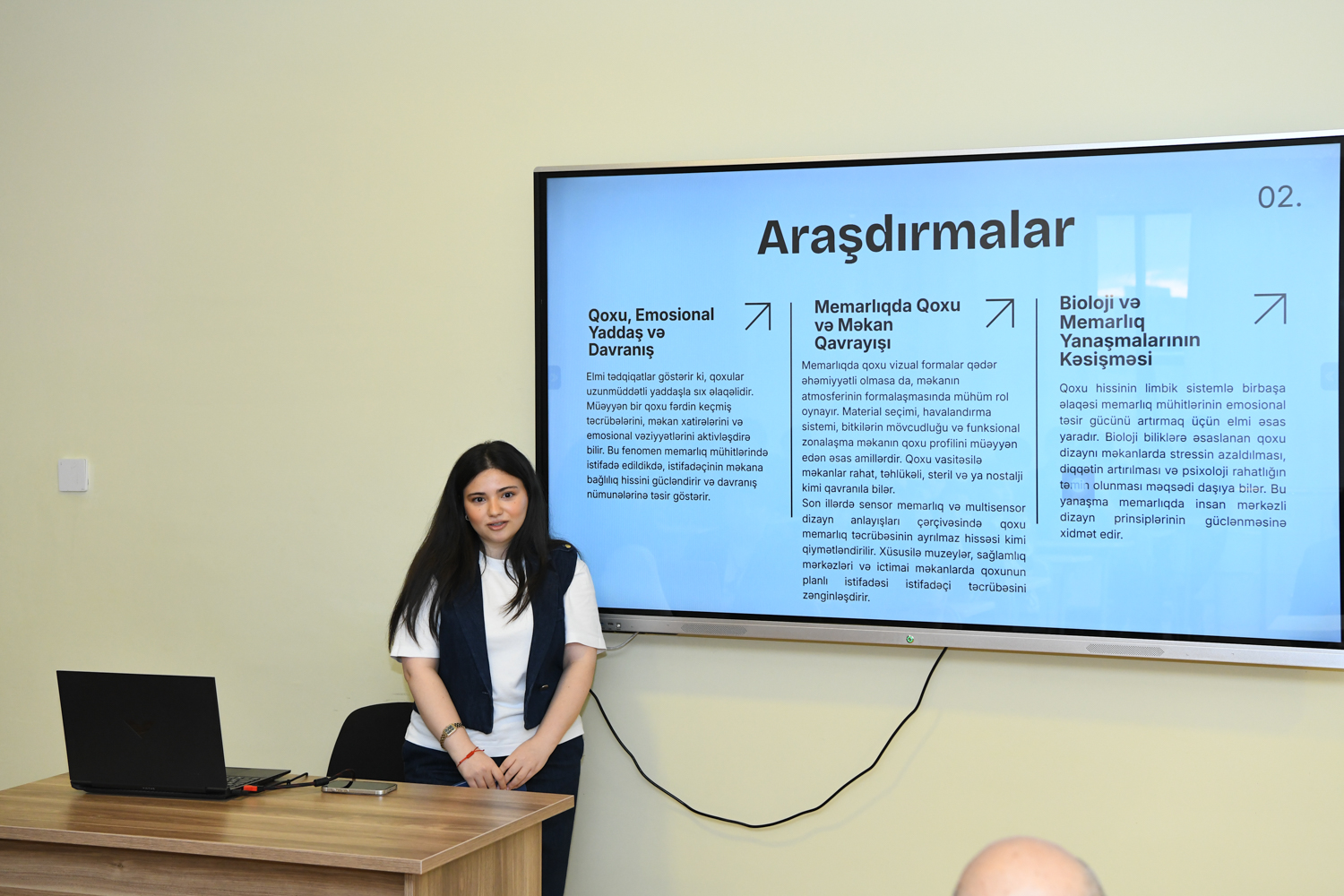 BMU-nun dosenti, “Memarlıq erqonomikası” fənninin müəllimi Arzu Məmmədova çıxış edərək tələbələrin müasir memarlıqda erqonomika, məkanın duyusal qavranılması, insan-məkan münasibətləri ilə bağlı apardığı araşdırma və təhlilləri diqqətə çatdırıb. Bildirilib ki, bu istiqamət müasir şəhərsalma və memarlıq praktikası baxımından hazırda ölkəmiz üçün aktuallıq kəsb edir.